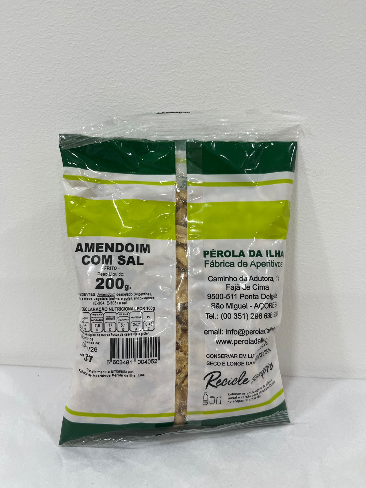 Amendoim com Sal 200g 2,80 € Desconto de %. Amendoim frito com sal feito em São Miguel, Açores. Pacote de 200g. Quantidade Comprar Contactar 1 unidades em stock Marca Pérola Partilhar Descrição Informação Geral Tabela Nutricional Amendoim frito com sal feito em São Miguel, Açores. Pacote de 200g. Ingredientes: Amendoim despelado (93,75%) (China); óleo de girassol refinado alto oleico e sal (0.62%). Modo de Conservação: Manter o produto fora da luz solar ou junto de fontes de calor. Guardar e expor em lugares secos e frescos. Energia - 2631jk / 636 kcal Lípidos - 54g Dos quais Saturados - 7,8g Hidratos de Carbono - 17g Dos quais açucares - 5,1g Proteínas - 24,7g Sal - 0,43g Também poderá gostar de