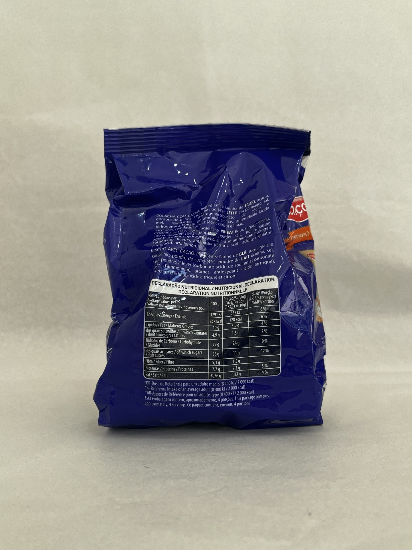 Ingredientes: farinha de trigo, açúcar; gordura de palma; cacau em pó (4%), leite em pó magro, sal, mel, levedantes (hidrogenocarbonato de sódio e hidrogenocarbontato de amónio), antioxidante (ácido tartárico), regulador acidez (ácido cítrico) e limão