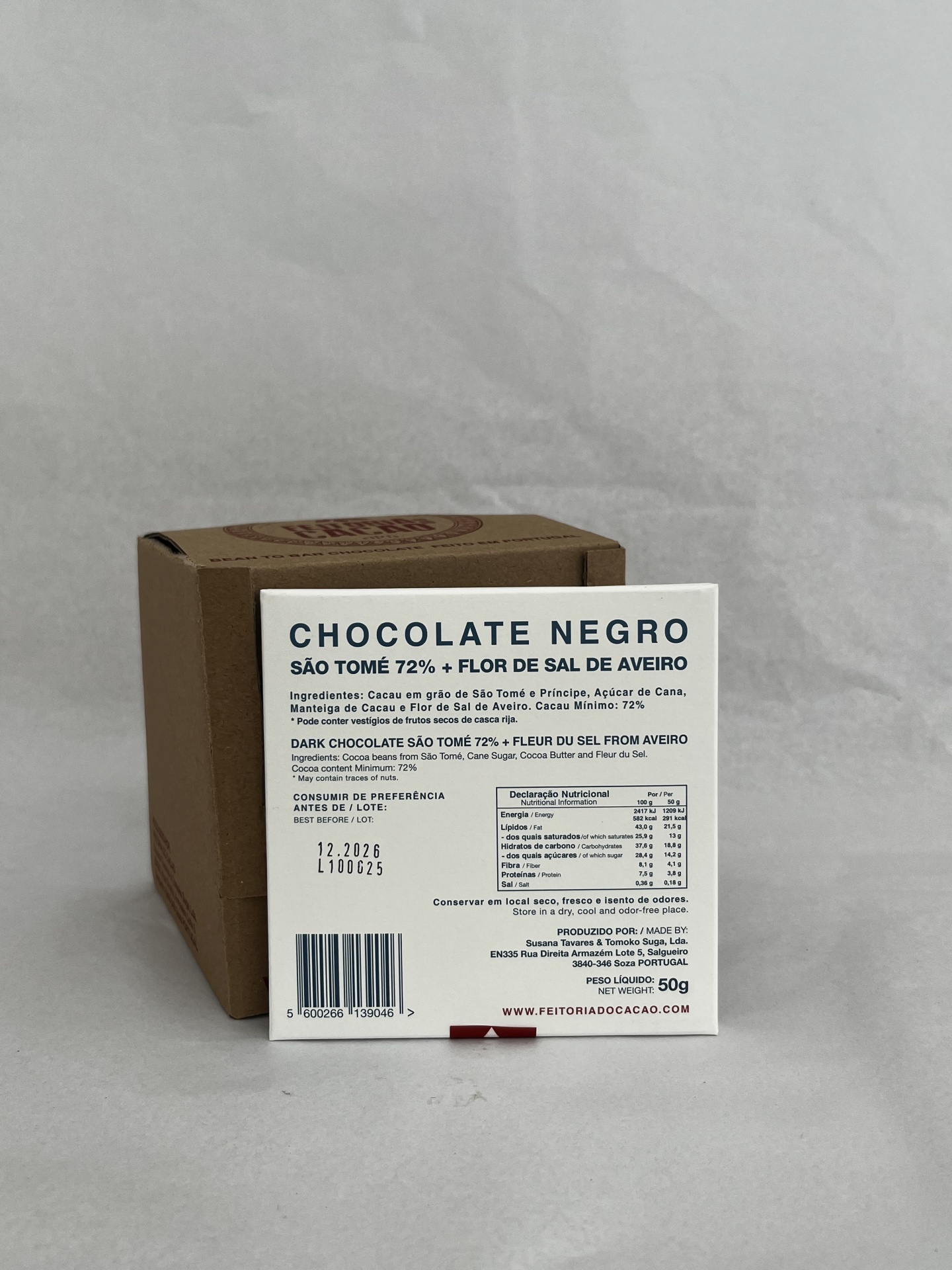 Cacau em grão de São Tomé, Açúcar de Cana, Manteiga de Cacau e Flor de Sal.