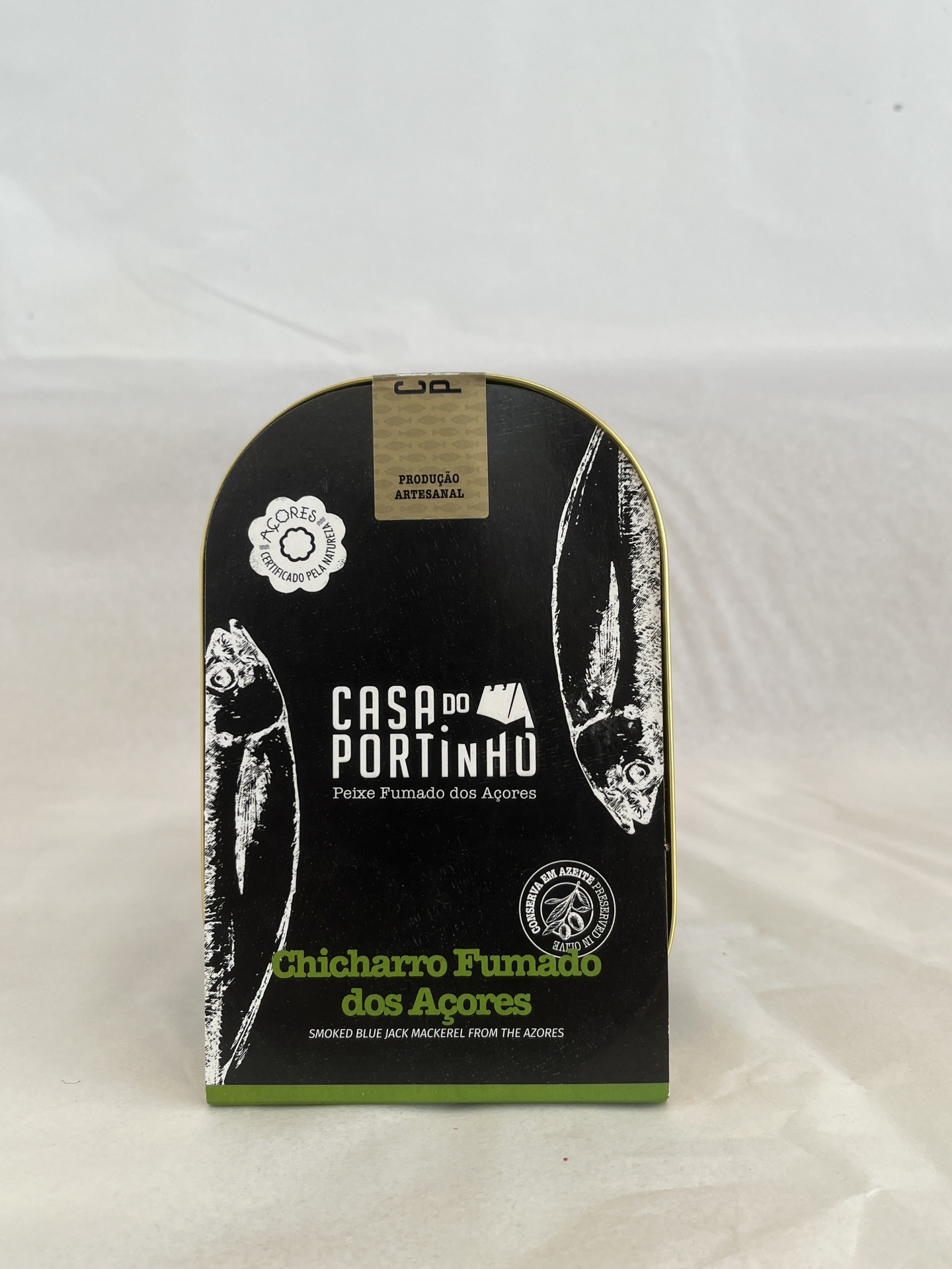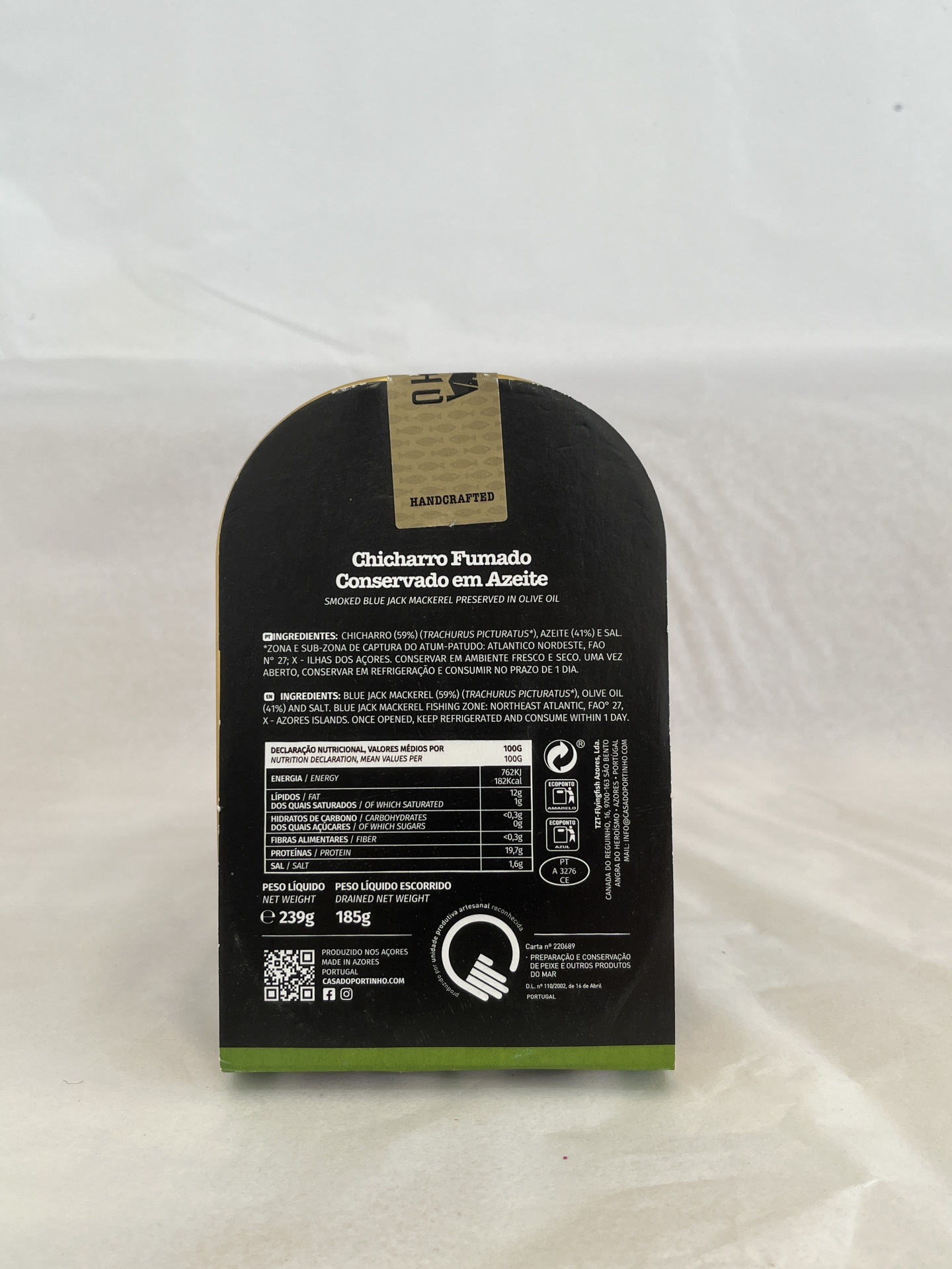 Chicharro Fumado dos Açores 8,90 € Desconto de %. Chicharro fumado dos Açores. Conserva com sabor tradicional. Quantidade Comprar Contactar 1 unidades em stock Marca Casa do Portinho Tags açoresconservascasa do portinho Partilhar Descrição Informação Geral Filete de chicharro fumado em azeite, com sabor rústico e envolvente. Produzido artesanalmente nos Açores. Ingredientes: chicharro (59%), azeite (41%) e sal. Conservação e Utilização: Conservar num lugar fresco e seco. Após abertura, conservar em refrigeração e consumir no prazo de 1 dia. Peso Líquido: 239gPeso Escorrido: 185g Também poderá gostar de